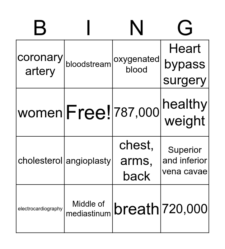 This bingo card has 16 words: Middle of mediastinum, Superior and inferior vena cavae, oxygenated blood, coronary artery, cholesterol, bloodstream, chest, arms, back, breath, women, Free!, electrocardiography, Heart bypass surgery, angioplasty, healthy weight, 787,000 and 720,000.