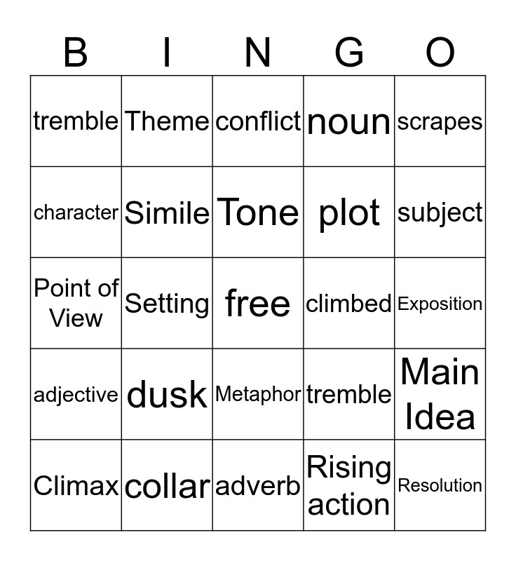 This bingo card has a free space and 24 words: dusk, collar, Tone, Climax, scrapes, tremble, character, Theme, climbed, Metaphor, plot, Point of View, tremble, Main Idea, Simile, Rising action, Exposition, conflict, subject, Setting, Resolution, adjective, noun and adverb.