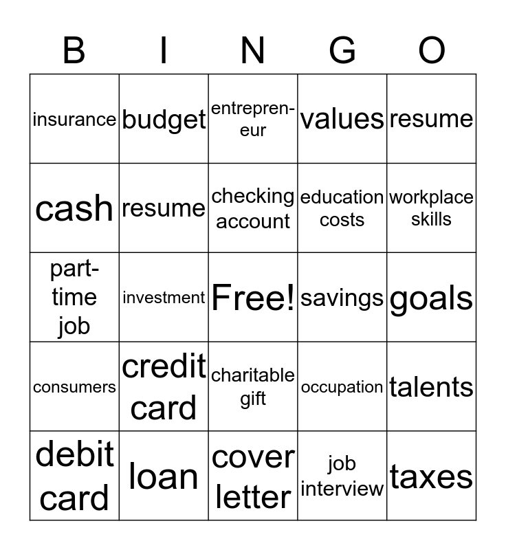 This bingo card has a free space and 24 words: credit card, loan, checking account, debit card, resume, insurance, cash, budget, savings, charitable gift, education costs, part-time job, occupation, talents, resume, job interview, goals, entrepren-eur, workplace skills, investment, taxes, consumers, values and cover letter.