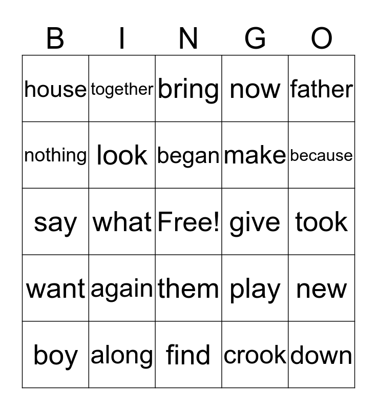 This bingo card has a free space and 24 words: again, along, began, boy, father, house, nothing, together, give, them, make, say, play, new, look, crook, took, bring, because, what, down, want, now and find.