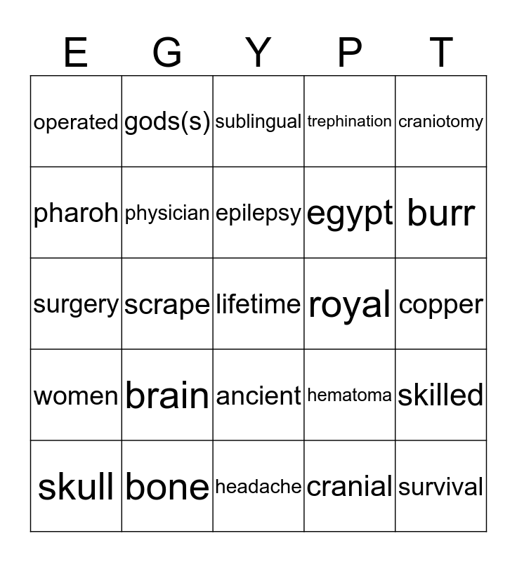 This bingo card has 25 words: brain, headache, epilepsy, skull, craniotomy, operated, pharoh, gods(s), royal, ancient, egypt, surgery, hematoma, skilled, physician, survival, copper, sublingual, burr, scrape, lifetime, bone, women, trephination and cranial.