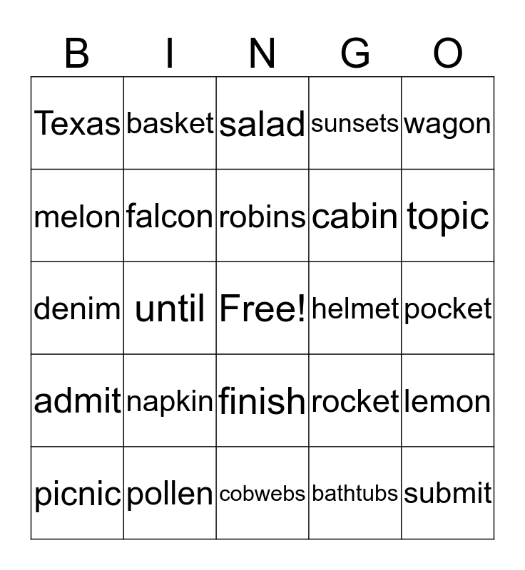 This bingo card has a free space and 24 words: picnic, napkin, robins, bathtubs, wagon, Texas, basket, salad, helmet, pocket, denim, falcon, rocket, lemon, melon, pollen, cobwebs, sunsets, topic, admit, until, finish, cabin and submit.
