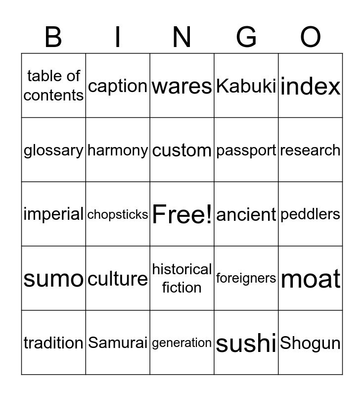 This bingo card has a free space and 25 words: culture, generation, custom, tradition, index, table of contents, glossary, caption, ancient, historical fiction, passport, imperial, foreigners, moat, harmony, briskly, peddlers, wares, research, chopsticks, Shogun, Samurai, sumo, Kabuki and sushi.