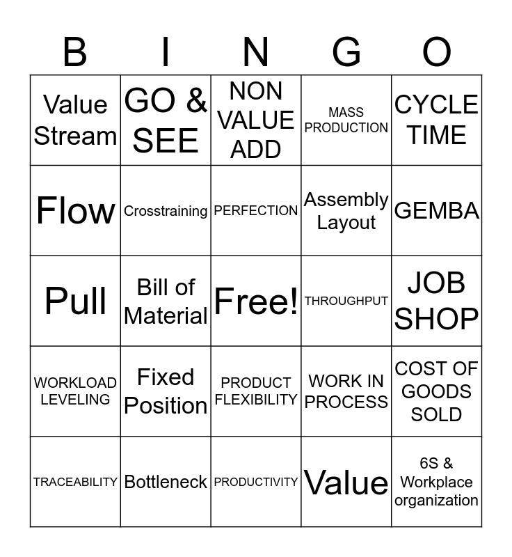 This bingo card has a free space and 24 words: Fixed Position, Bottleneck, PERFECTION, TRACEABILITY, CYCLE TIME, Value Stream, Flow, GO & SEE, THROUGHPUT, PRODUCT FLEXIBILITY, Assembly Layout, Pull, WORK IN PROCESS, COST OF GOODS SOLD, Crosstraining, Value, JOB SHOP, NON VALUE ADD, GEMBA, Bill of Material, 6S & Workplace organization, WORKLOAD LEVELING, MASS PRODUCTION and PRODUCTIVITY.