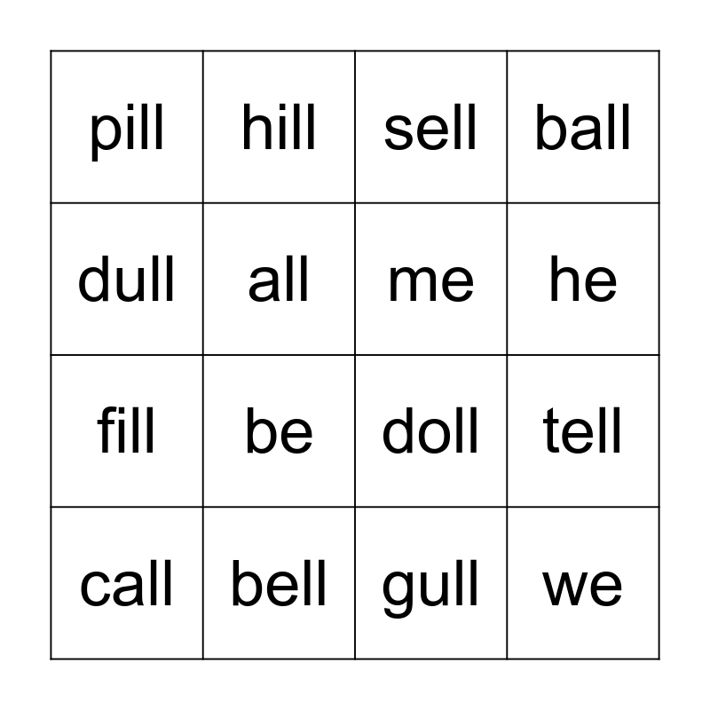 This bingo card has 16 words: bell, tell, sell, pill, fill, hill, doll, gull, dull, all, call, ball, be, he, me and we.