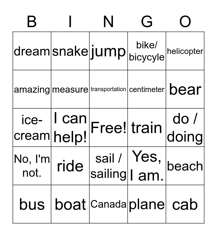 This bingo card has a free space and 44 words: motorcycle, cab, skateboard, bus, truck, plane, jump, scooter, helicopter, boat, bike/ bicycyle, train, sail / sailing, ride, Africa, Canada, Italy, ice-cream, world, bear, snake, boots, wear, dream, look / looking, do / doing, wait / waiting, play / playing, Yes, I am., No, I'm not., move / moving, beach, excited / exciting, No problem!, I can help!, Please., You're welcome., museum, transportation, amazing, centimeter, ruler, measure and railroad tracks.