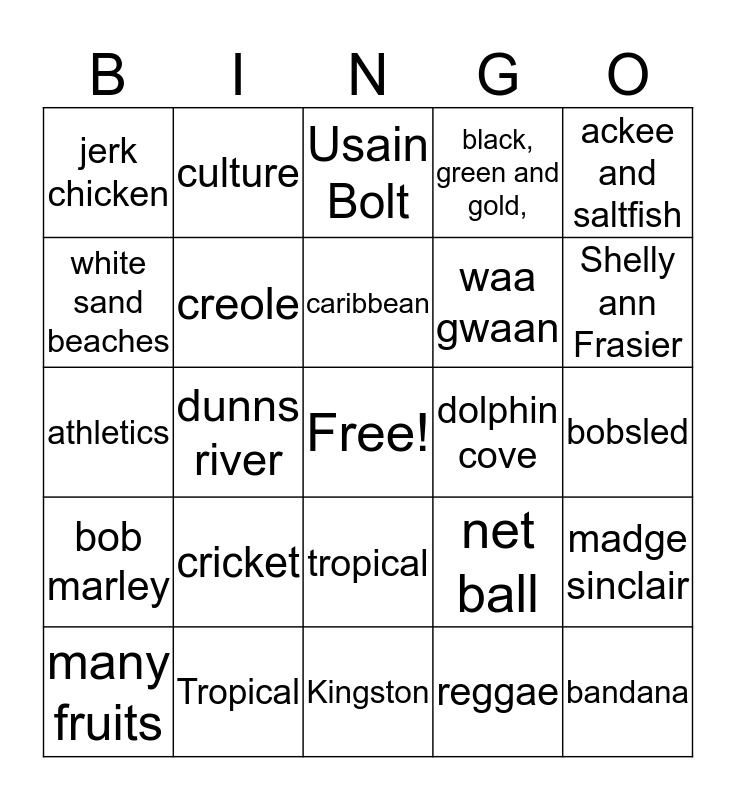 This bingo card has a free space and 26 words: bob marley, Tropical, caribbean, reggae, ackee and saltfish, jerk chicken, creole, Usain Bolt, waa gwaan, bandana, white sand beaches, dunns river, blue mountain, net ball, bobsled, dancehall, culture, tropical, black, green and gold,, madge sinclair, athletics, cricket, Kingston, dolphin cove, Shelly ann Frasier and many fruits.