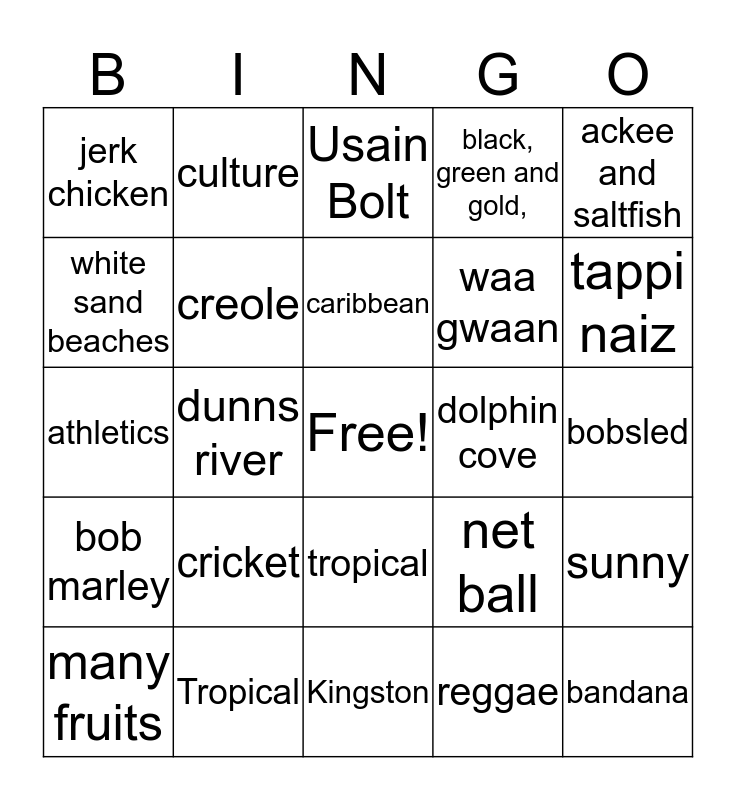 This bingo card has a free space and 26 words: bob marley, Tropical, caribbean, reggae, ackee and saltfish, jerk chicken, creole, Usain Bolt, waa gwaan, bandana, white sand beaches, dunns river, blue mountain, net ball, bobsled, dancehall, culture, tropical, black, green and gold,, sunny, athletics, cricket, Kingston, dolphin cove, tappi naiz and many fruits.