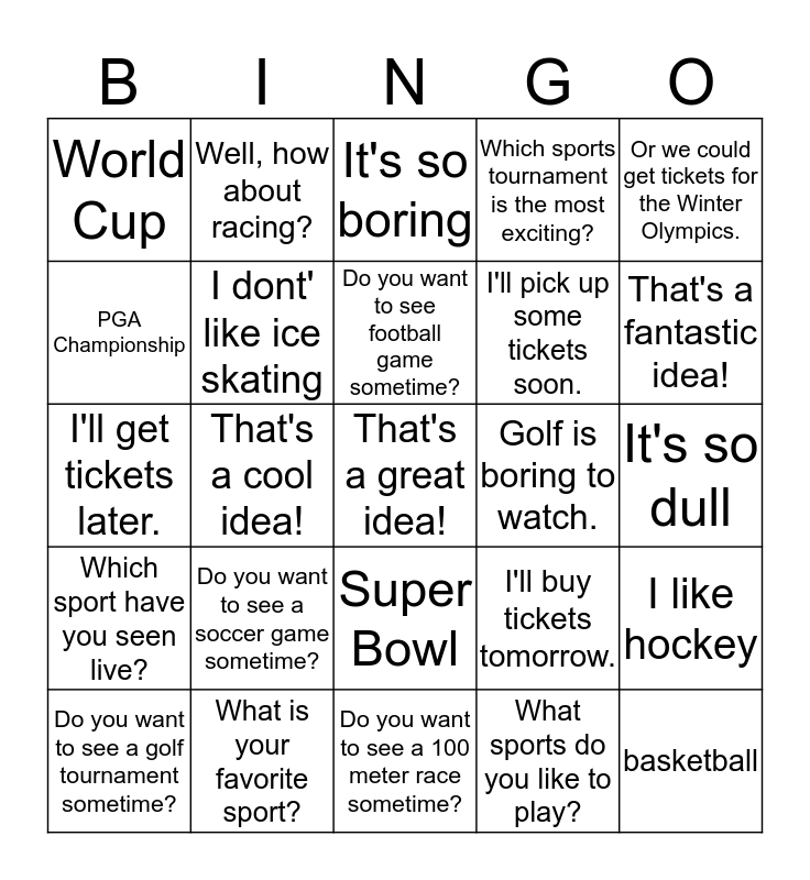 This bingo card has 25 words: Do you want to see a soccer game sometime?, Do you want to see a 100 meter race sometime?, Do you want to see football game sometime?, Do you want to see a golf tournament sometime?, Or we could get tickets for the Winter Olympics., World Cup, PGA Championship, Well, how about racing?, Golf is boring to watch., Super Bowl, I'll pick up some tickets soon., I'll get tickets later., I'll buy tickets tomorrow., I like hockey, I dont' like ice skating, basketball, It's so dull, It's so boring, That's a fantastic idea!, That's a cool idea!, That's a great idea!, What is your favorite sport?, Which sport have you seen live?, Which sports tournament is the most exciting? and What sports do you like to play?.
