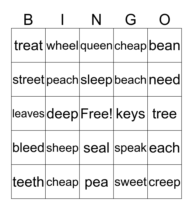 This bingo card has a free space and 24 words: sheep, cheap, sleep, teeth, bean, treat, street, wheel, keys, seal, beach, leaves, speak, each, peach, sweet, tree, queen, need, deep, creep, bleed, cheap and pea.