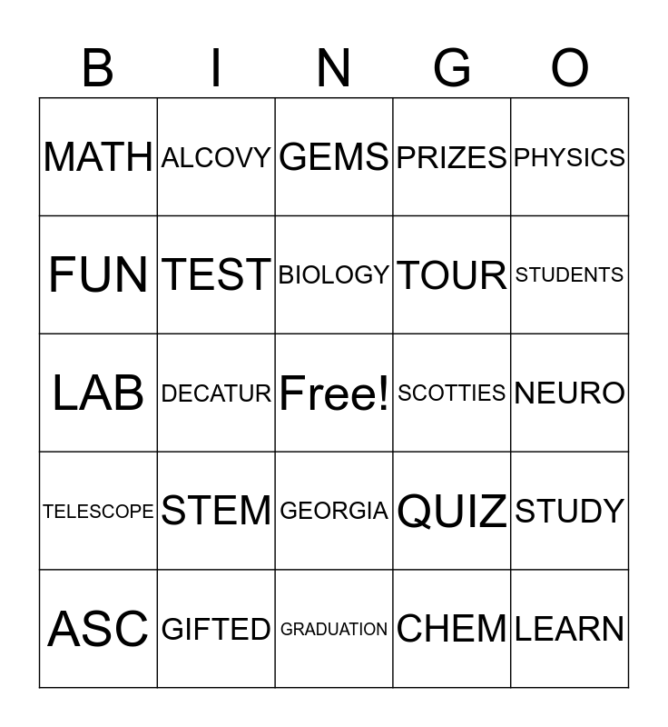 This bingo card has a free space and 24 words: ASC, STEM, BIOLOGY, CHEM, PHYSICS, MATH, ALCOVY, GEMS, SCOTTIES, NEURO, LAB, TEST, QUIZ, STUDY, FUN, GIFTED, GRADUATION, PRIZES, STUDENTS, TELESCOPE, DECATUR, GEORGIA, TOUR and LEARN.