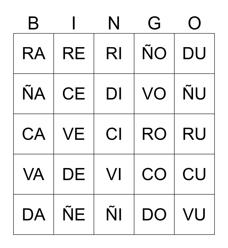 This bingo card has a free space and 24 words: DA, DE, DI, DO, DU, RA, RE, RI, RO, RU, CA, CE, CO, CU, ÑA, ÑE, ÑI, ÑO, ÑU, VA, VE, VI, VO and VU.