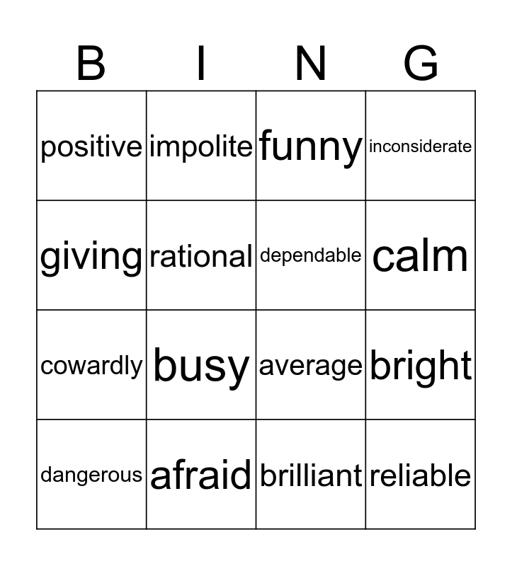 This bingo card has 16 words: afraid, bright, funny, positive, cowardly, impolite, average, brilliant, giving, rational, dangerous, inconsiderate, busy, calm, dependable and reliable.