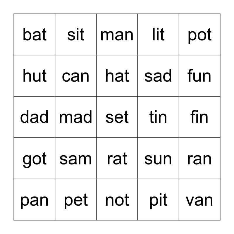 This bingo card has a free space and 24 words: sam, pet, hat, pan, pot, bat, hut, sit, tin, rat, sad, dad, sun, ran, can, pit, fin, man, fun, mad, van, got, lit and not.