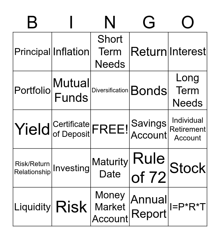 This bingo card has a free space and 24 words: Investing, Risk, Diversification, Liquidity, Interest, Principal, Portfolio, Inflation, Savings Account, Maturity Date, Bonds, Yield, Rule of 72, Stock, Mutual Funds, Annual Report, Individual Retirement Account, Short Term Needs, Long Term Needs, Certificate of Deposit, I=P*R*T, Risk/Return Relationship, Return and Money Market Account.