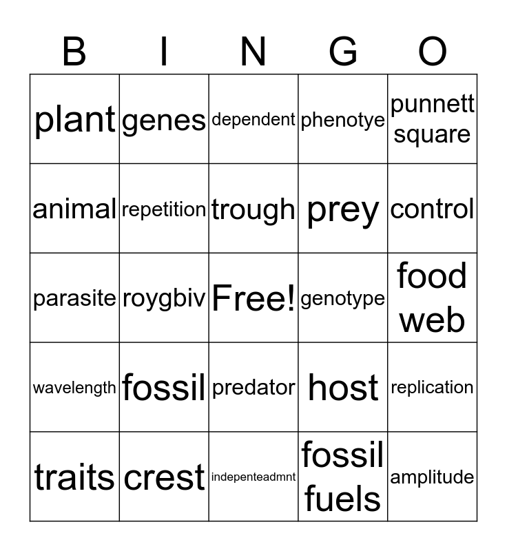 This bingo card has a free space and 24 words: fossil, crest, trough, traits, punnett square, plant, animal, genes, genotype, predator, prey, parasite, host, replication, repetition, fossil fuels, food web, dependent, control, roygbiv, amplitude, wavelength, phenotye and indepenteadmnt.