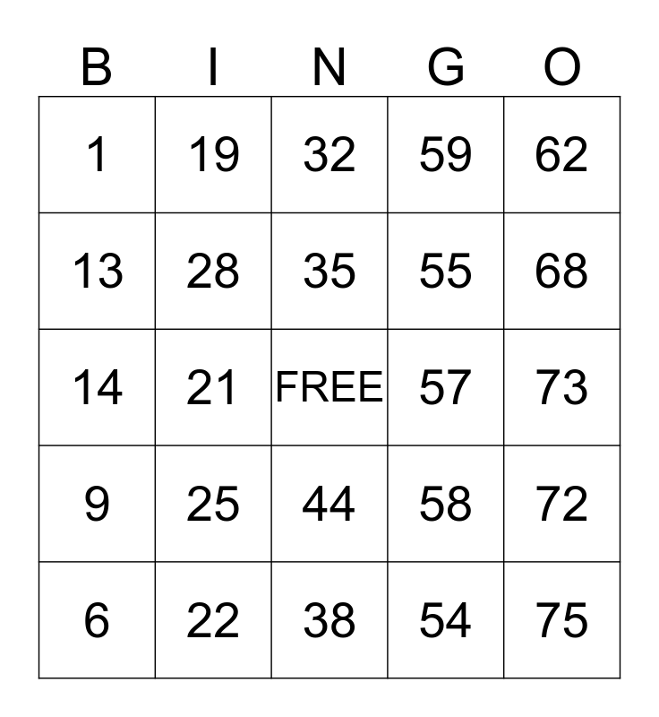 This bingo card has a free space and 24 words: 6, 25, 35, 54, 62, 1, 19, 32, 57, 73, 14, 28, 58, 72, 13, 22, 38, 59, 68, 9, 21, 44, 55 and 75.