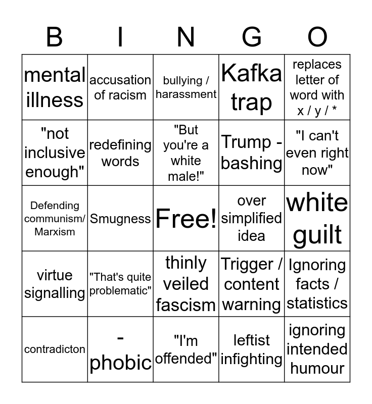 This bingo card has a free space and 24 words: "That's quite problematic", - phobic, "But you're a white male!", contradicton, replaces letter of word with x / y / *, mental illness, "not inclusive enough", accusation of racism, over simplified idea, thinly veiled fascism, Trump - bashing, Defending communism/ Marxism, Trigger / content warning, Ignoring facts / statistics, redefining words, leftist infighting, white guilt, bullying / harassment, "I can't even right now", Smugness, ignoring intended humour, virtue signalling, Kafka trap and "I'm offended".