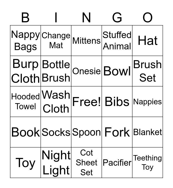 This bingo card has a free space and 38 words: Baby Wrap, Bath Toys, Beanie, Bibs, Blanket, Book, Bottle Brush, Bottles, Bowl, Brush Set, Burp Cloth, Change Mat, Cot Sheet Set, Fork, Hat, Hooded Towel, Lotion, Mittens, Nail Set, Nappies, Nappy Bags, Night Light, Onesie, Pacifier, Pants, Photo Frame, Rattle, Rubber Duck, Shampoo, Shirt, Sippy Cup, Socks, Spoon, Stuffed Animal, Teething Toy, Toy, Wash Cloth and Wet Wipes.