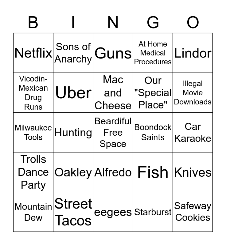 This bingo card has a free space and 24 words: Mountain Dew, Oakley, Mac and Cheese, Starburst, Lindor, Netflix, Sons of Anarchy, Guns, Boondock Saints, Car Karaoke, Milwaukee Tools, Uber, Fish, Knives, Vicodin-Mexican Drug Runs, Street Tacos, eegees, At Home Medical Procedures, Illegal Movie Downloads, Trolls Dance Party, Hunting, Alfredo, Our "Special Place" and Safeway Cookies.