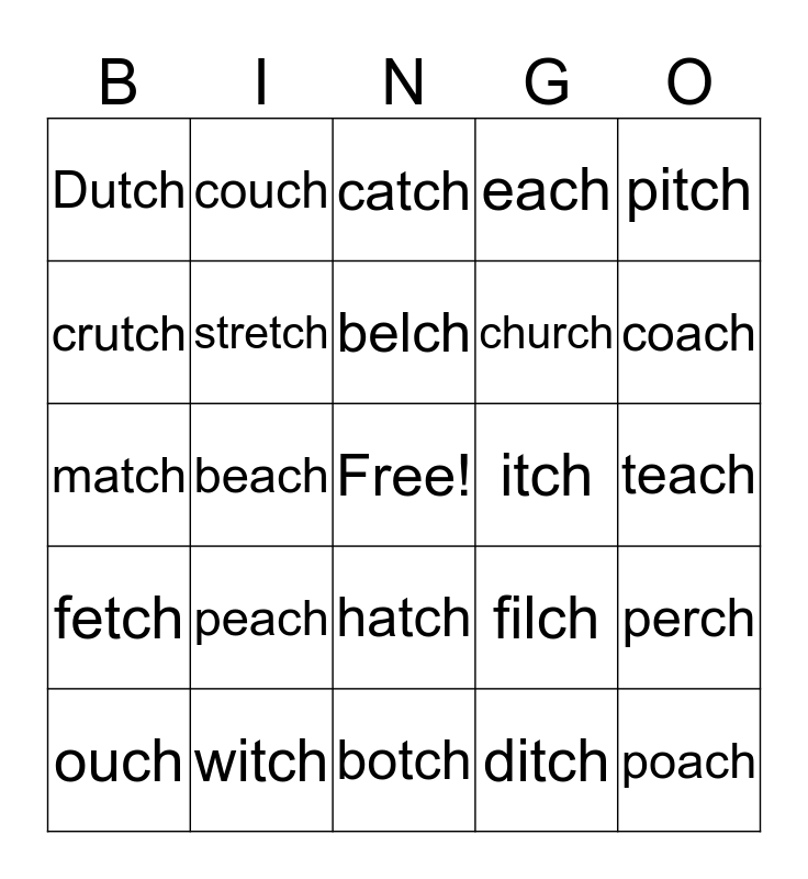 This bingo card has a free space and 24 words: peach, witch, belch, ouch, pitch, Dutch, crutch, couch, itch, hatch, church, match, filch, perch, stretch, ditch, teach, catch, coach, beach, poach, fetch, each and botch.