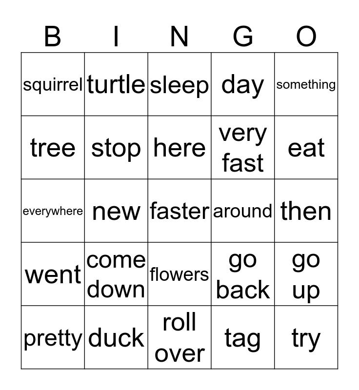 This bingo card has a free space and 24 words: come down, duck, here, pretty, something, squirrel, tree, turtle, around, flowers, very fast, everywhere, go back, go up, stop, tag, then, sleep, eat, new, try, went, day and roll over.