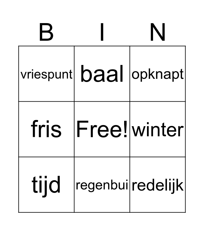 This bingo card has a free space and 13 words: volop, strak, tijd, baal, fris, redelijk, rotweer, snikheet, regenbui, vriespunt, winter, opknapt and depressief.