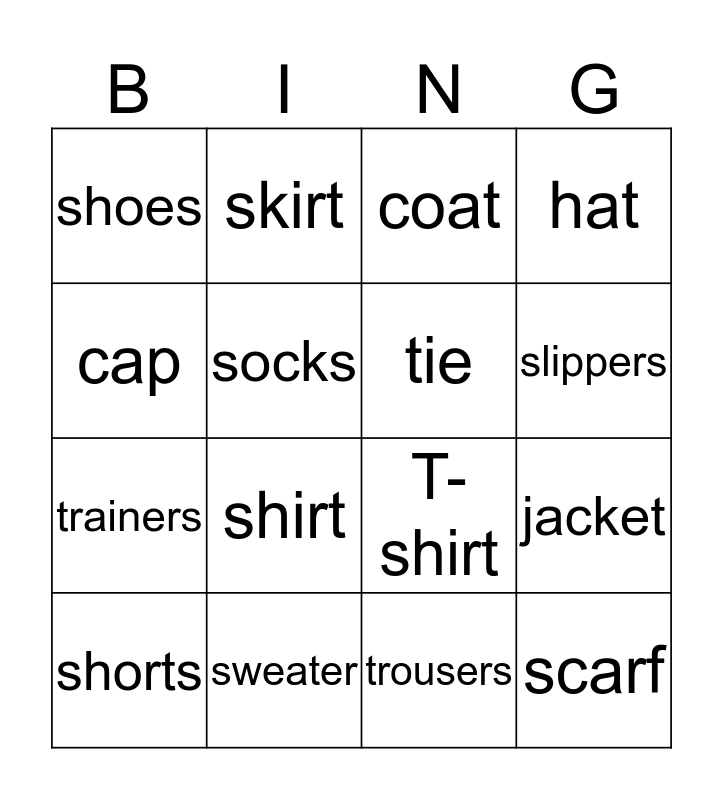 This bingo card has 16 words: sweater, jacket, coat, shoes, trainers, skirt, T-shirt, trousers, cap, socks, shorts, hat, shirt, slippers, tie and scarf.