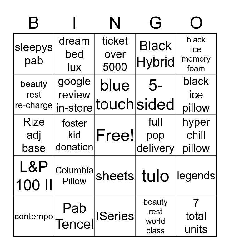 This bingo card has a free space and 24 words: Columbia Pillow, Pab Tencel, blue touch, contempo, black ice memory foam, sleepys pab, beauty rest re-charge, dream bed lux, full pop delivery, sheets, 5-sided, Rize adj base, tulo, legends, google review in-store, beauty rest world class, hyper chill pillow, ticket over 5000, black ice pillow, foster kid donation, 7 total units, L&P 100 II, Black Hybrid and ISeries.