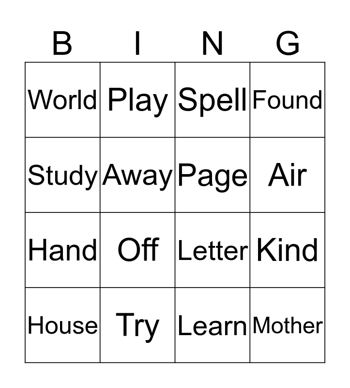 This bingo card has 16 words: Try, Kind, Spell, World, Hand, Play, Letter, Learn, Study, Away, House, Found, Off, Air, Page and Mother.