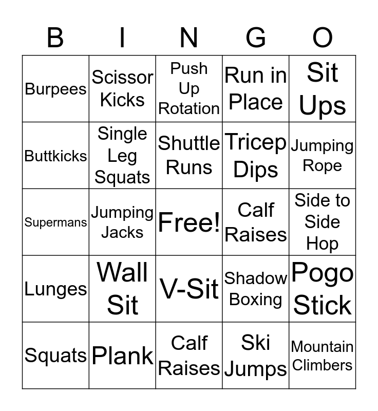 This bingo card has a free space and 24 words: Wall Sit, Plank, Shuttle Runs, Squats, Sit Ups, Burpees, Buttkicks, Scissor Kicks, Calf Raises, V-Sit, Tricep Dips, Supermans, Shadow Boxing, Pogo Stick, Single Leg Squats, Ski Jumps, Side to Side Hop, Push Up Rotation, Jumping Rope, Jumping Jacks, Mountain Climbers, Lunges, Run in Place and Calf Raises.