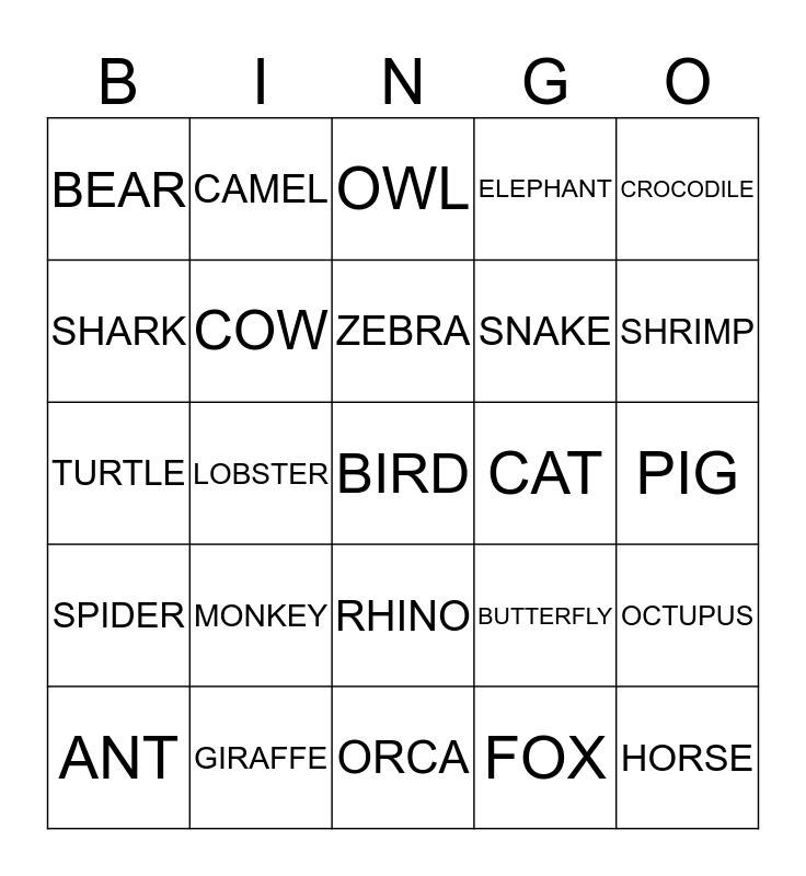 This bingo card has a free space and 24 words: MONKEY, GIRAFFE, ZEBRA, ANT, CROCODILE, BEAR, SHARK, CAMEL, CAT, RHINO, SNAKE, TURTLE, BUTTERFLY, OCTUPUS, COW, FOX, PIG, OWL, SHRIMP, LOBSTER, HORSE, SPIDER, ELEPHANT and ORCA.