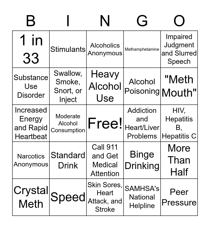 This bingo card has a free space and 24 words: Standard Drink, Speed, Heavy Alcohol Use, Crystal Meth, Impaired Judgment and Slurred Speech, 1 in 33, Substance Use Disorder, Stimulants, Addiction and Heart/Liver Problems, Call 911 and Get Medical Attention, Alcohol Poisoning, Increased Energy and Rapid Heartbeat, Binge Drinking, More Than Half, Swallow, Smoke, Snort, or Inject, SAMHSA's National Helpline, HIV, Hepatitis B, Hepatitis C, Alcoholics Anonymous, "Meth Mouth", Moderate Alcohol Consumption, Peer Pressure, Narcotics Anonymous, Methamphetamine and Skin Sores, Heart Attack, and Stroke.