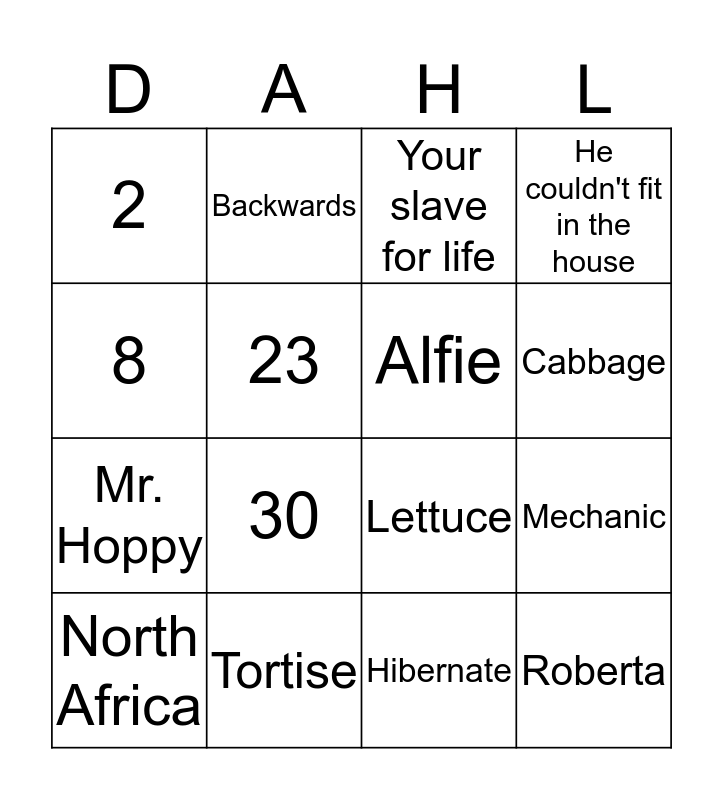 This bingo card has 17 words: Hibernate, North Africa, Your slave for life, 2, 30, He couldn't fit in the house, Mechanic, Alfie, Cabbage, 23, Tortise, Lettuce, 8, Backwards, Mr. Hoppy, Roberta and Roberta.