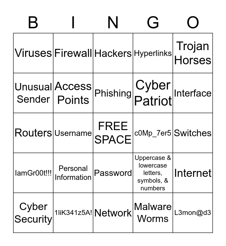 This bingo card has a free space and 24 words: Cyber Security, Personal Information, Phishing, Malware Worms, Trojan Horses, Viruses, Firewall, Hackers, c0Mp_7er5, Switches, Routers, Access Points, Uppercase & lowercase letters, symbols, & numbers, Internet, Unusual Sender, 1liK341z5A!, Network, Hyperlinks, Interface, IamGr00t!!!, Username, Password, Cyber Patriot and L3mon@d3.
