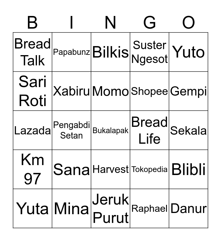 This bingo card has a free space and 24 words: Sana, Mina, Momo, Yuta, Yuto, Bread Talk, Sari Roti, Papabunz, Bread Life, Harvest, Shopee, Lazada, Tokopedia, Blibli, Xabiru, Raphael, Sekala, Bilkis, Gempi, Pengabdi Setan, Danur, Km 97, Suster Ngesot and Jeruk Purut.