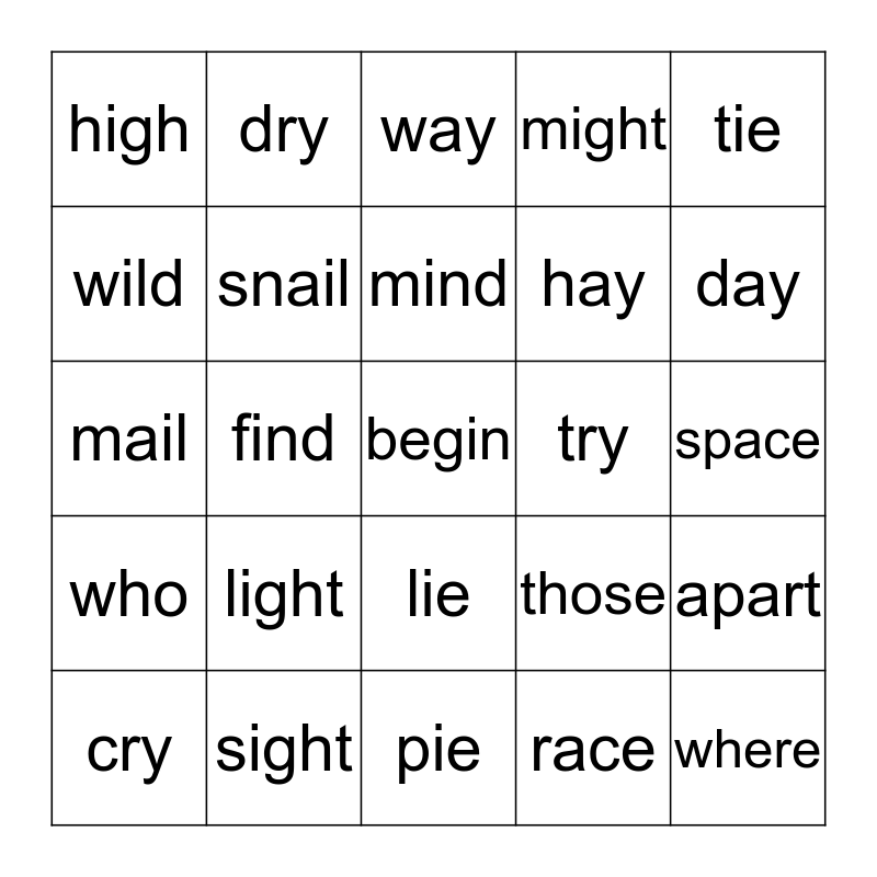 This bingo card has a free space and 24 words: light, sight, mind, cry, tie, high, wild, dry, try, lie, hay, mail, those, apart, snail, race, space, way, day, find, where, who, might and pie.