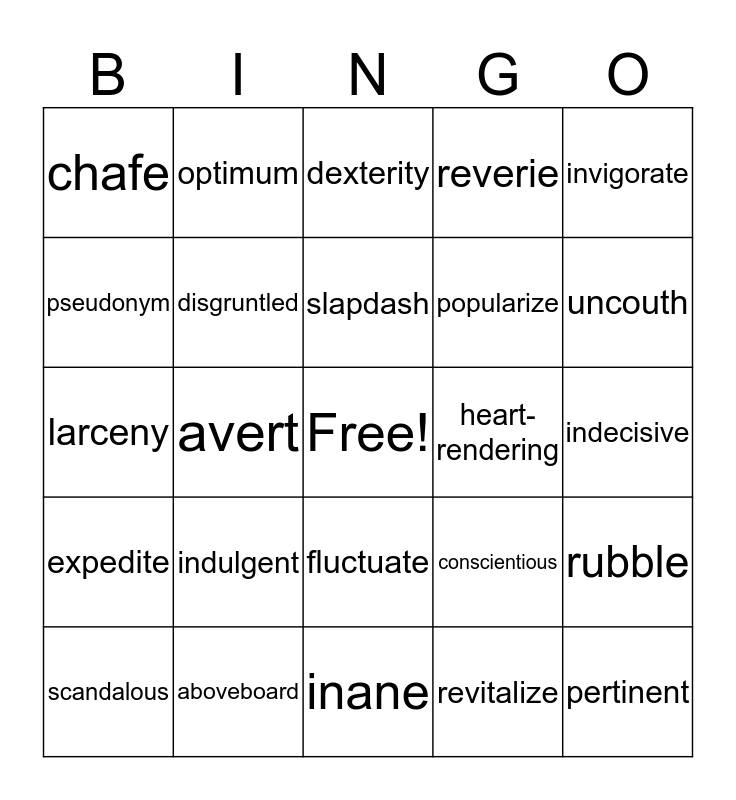 This bingo card has a free space and 30 words: aboveboard, aggression, avert, burly, chafe, dexterity, disgruntled, fluctuate, heart-rendering, inane, indecisive, pertinent, revitalize, scant, uncouth, accentuate, conscientious, expedite, indulgent, invigorate, larceny, morose, optimum, popularize, pseudonym, reverie, rubble, scandalous, slapdash and unruffled.