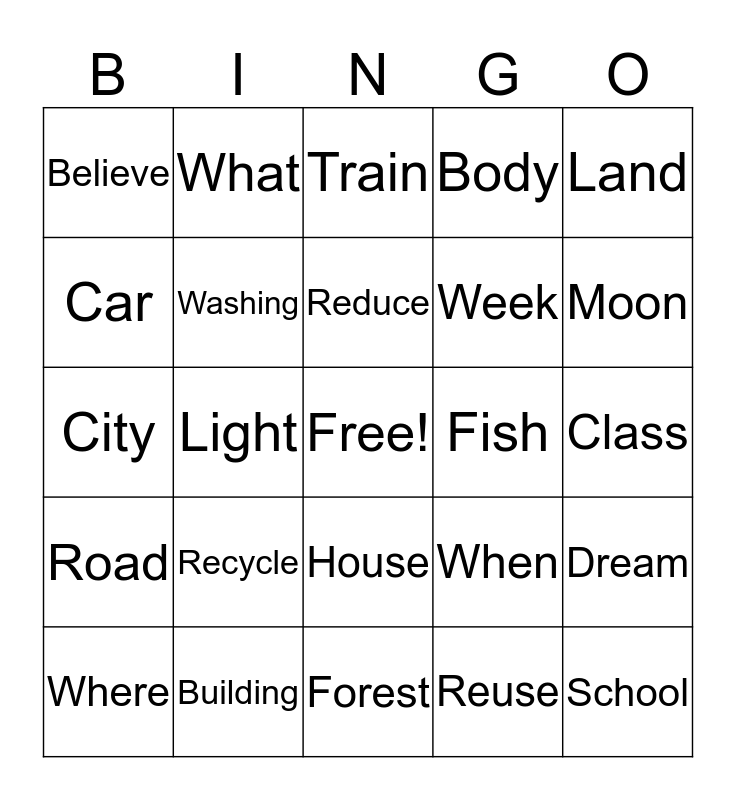 This bingo card has a free space and 24 words: Where, Recycle, Reduce, Reuse, Land, Believe, What, Train, Fish, Class, City, Washing, When, Dream, Car, Building, Forest, Body, Moon, Road, Light, House, Week and School.