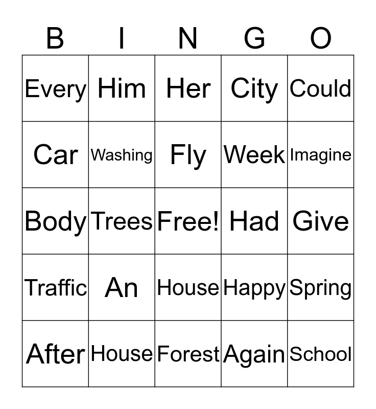 This bingo card has a free space and 24 words: After, An, Fly, Again, Could, Every, Him, Her, Had, Give, Body, Washing, Happy, Spring, Car, House, Forest, City, Imagine, Traffic, Trees, House, Week and School.