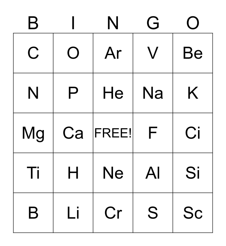 This bingo card has a free space and 24 words: H, Li, He, B, Be, C, N, O, F, Ne, Na, Mg, Al, Si, P, S, Ci, Ar, K, Ca, Sc, Ti, V and Cr.