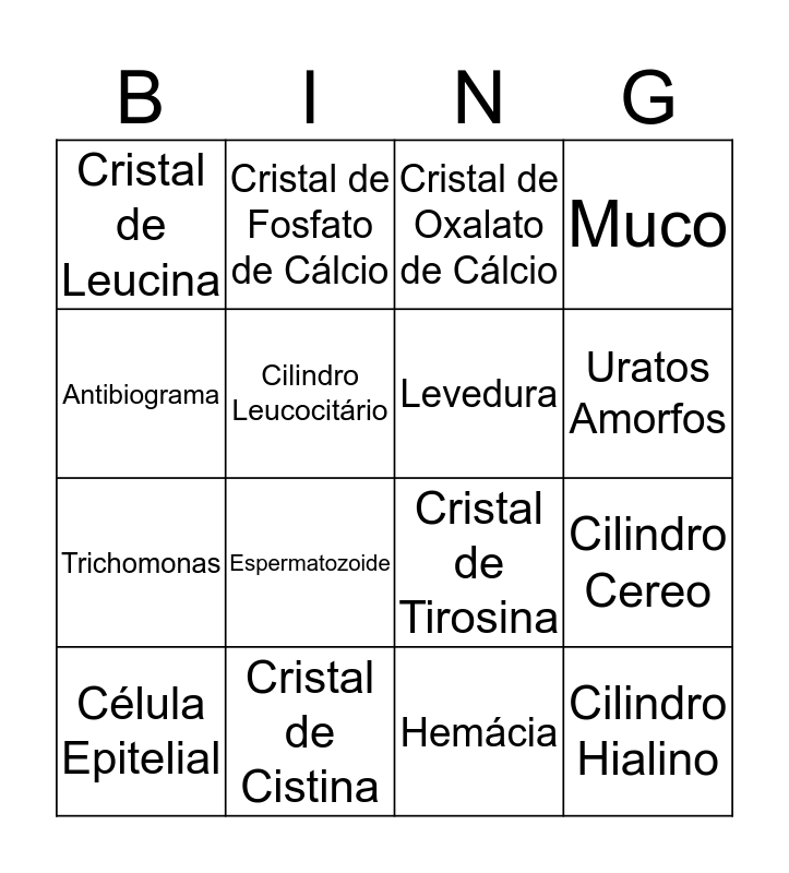 This bingo card has 20 words: Célula Epitelial, Cristal de Ácido Úrico, Cristal de Oxalato de Cálcio, Cilindro Cereo, Uratos Amorfos, Espermatozoide, Hemácia, Muco, Trichomonas, Cristal de Fosfato de Cálcio, Cristal de Tirosina, Uratos Amorfos, Cristal de Leucina, Cristal de Cistina, Levedura, Leucócito, Antibiograma, Cilindro Leucocitário, Cilindro Hemático and Cilindro Hialino.