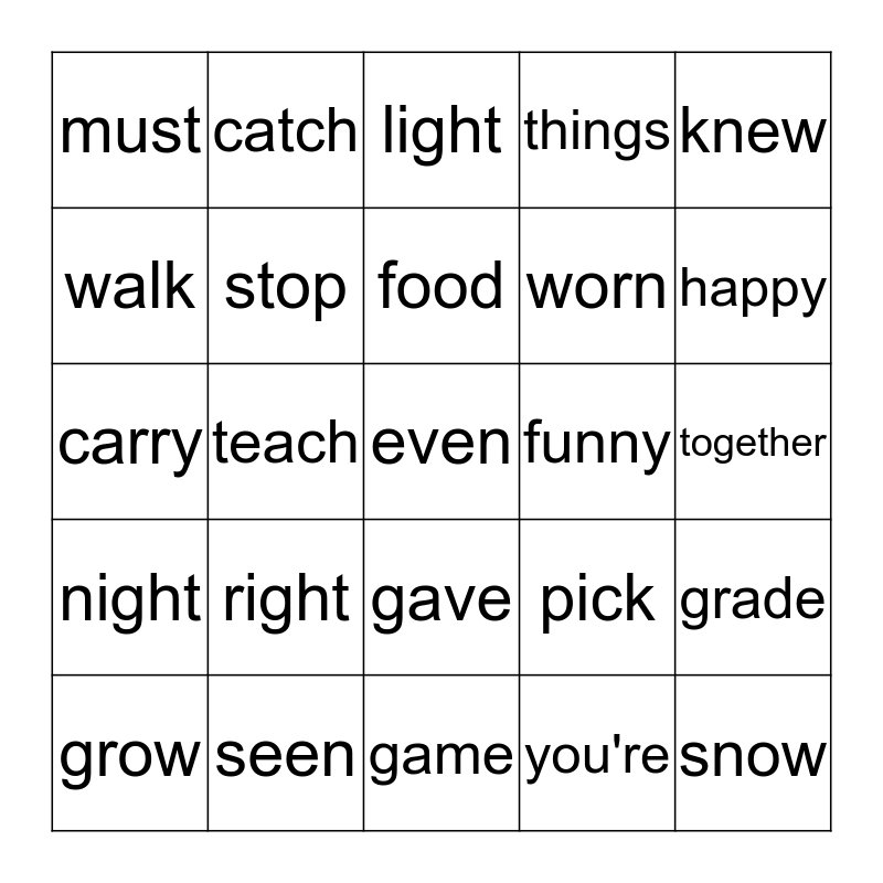 This bingo card has 25 words: right, game, food, grow, knew, must, walk, catch, funny, gave, worn, carry, pick, grade, stop, snow, together, light, happy, teach, even, seen, night, things and you're.