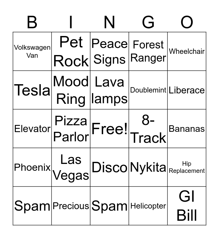 This bingo card has a free space and 30 words: Precious, Germany, Pizza Parlor, Groovy, Volkswagen Van, Peace Signs, Mood Ring, Disco, 8-Track, Spam, Bananas, GI Bill, Helicopter, Kathryn, Liberace, Quincey, Nykita, Phoenix, Las Vegas, Wheelchair, Elevator, Attorney, Pet Rock, Doublemint, Tesla, Forest Ranger, Hip Replacement, Spam, Lava lamps and Mr. Yuk.