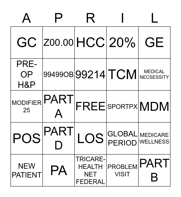 This bingo card has a free space and 24 words: PART D, PA, 99214, NEW PATIENT, GE, GC, PRE-OP H&P, Z00.00, SPORTPX, LOS, TCM, MODIFIER 25, GLOBAL PERIOD, MEDICARE WELLNESS, 99499OB, PROBLEM VISIT, MDM, HCC, MEDICAL NECSESSITY, PART A, PART B, POS, 20% and TRICARE- HEALTH NET FEDERAL.