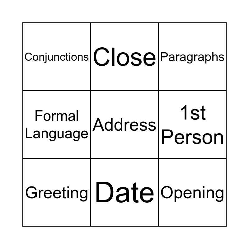 This bingo card has a free space and 8 words: 1st Person, Paragraphs, Close, Greeting, Conjunctions, Opening, Formal Language and Date.