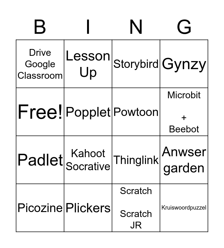 This bingo card has 16 words: Plickers, Anwser garden, Storybird, Drive Google Classroom, Padlet, Lesson Up, Thinglink, Scratch Scratch JR, Free!, Popplet, Picozine, Gynzy, Kahoot Socrative, Microbit + Beebot, Powtoon and Kruiswoordpuzzel.