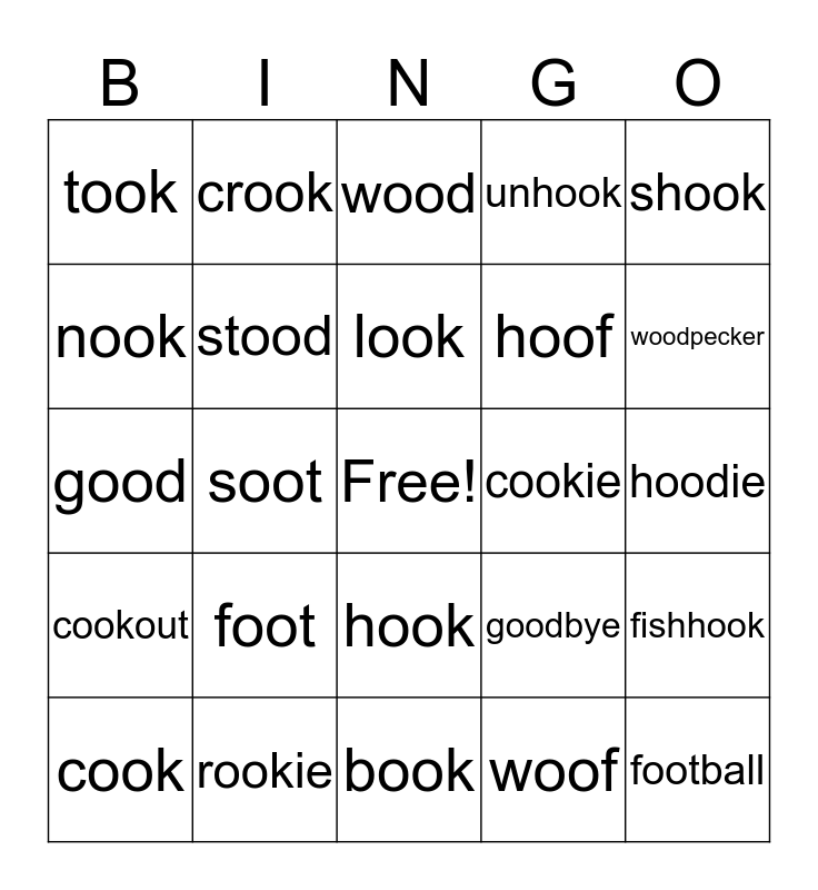 This bingo card has a free space and 25 words: foot, book, look, cook, shook, took, nook, crook, cookie, hook, hoof, good, goodbye, fishhook, stood, hood, hoodie, wood, woodpecker, soot, football, rookie, cookout, unhook and woof.