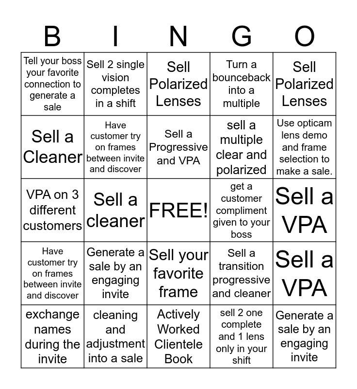 This bingo card has a free space and 24 words: Generate a sale by an engaging invite, cleaning and adjustment into a sale, Sell a Progressive and VPA, exchange names during the invite, Sell Polarized Lenses, Tell your boss your favorite connection to generate a sale, Sell a Cleaner, Sell 2 single vision completes in a shift, get a customer compliment given to your boss, Sell your favorite frame, sell a multiple clear and polarized, VPA on 3 different customers, Sell a transition progressive and cleaner, Sell a VPA, Have customer try on frames between invite and discover, sell 2 one complete and 1 lens only in your shift, Sell a VPA, Sell Polarized Lenses, Use opticam lens demo and frame selection to make a sale., Sell a cleaner, Generate a sale by an engaging invite, Have customer try on frames between invite and discover, Turn a bounceback into a multiple and Actively Worked Clientele Book.