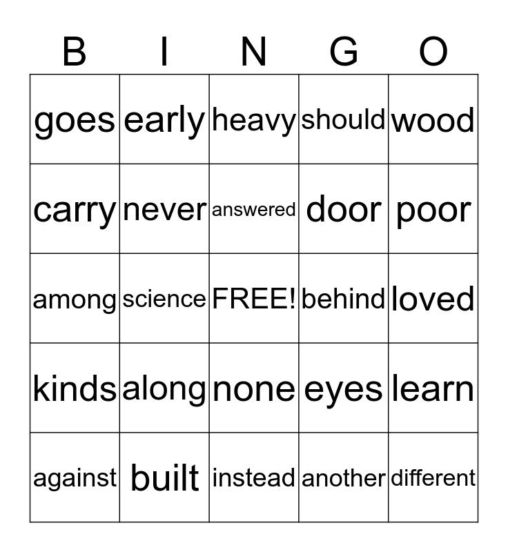 This bingo card has a free space and 24 words: along, built, answered, against, wood, goes, carry, early, behind, none, door, among, eyes, learn, never, another, loved, heavy, poor, science, different, kinds, should and instead.